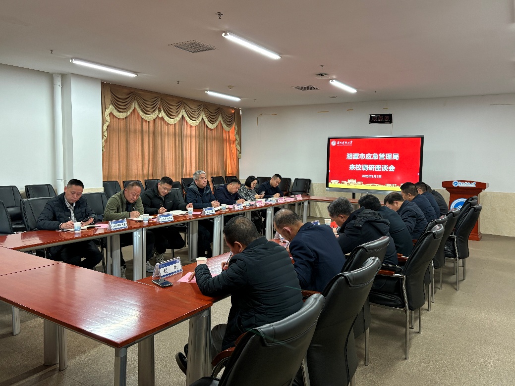 17日下午,湘潭市应急管理局局长席晓刚一行来校调研座谈。副校长周虎主持会议,副校长王卫军出席。